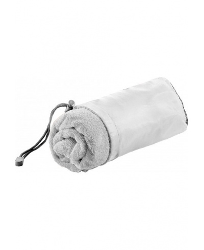 80% polyester / 20% polyamide. Light weight towel for ultra-fast drying. Overlocked seams. Contrast zipped pocket at lower corner. Polyamide color coordinated carry pouch with elasticated drawstring and meshed bottom for ventilation (color Soft Blue: pocket in contrasting Navy). Pocket size: 25 cm. Size: 100 x 50 cm