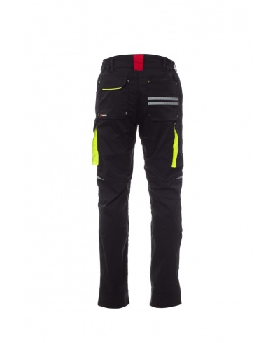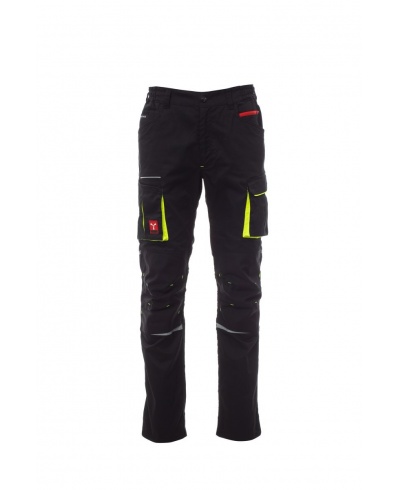 Unisex pants, stretch, all-season, elastic bands on the sides and belt loops at the waist, zipper closure and a customized button. The trousers have two shaped pockets on the front, a coin pocket on the right side and a zippered safety pocket on the left side. On the front of the left leg there is a gusset pocket, a Velcro flap and a name tag pouch. On the front of the right leg there is a phone pocket with a reflective hem and a pocket with a gusset. Both legs have attachments for Nylon O knee pads.