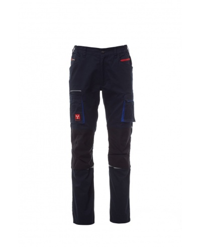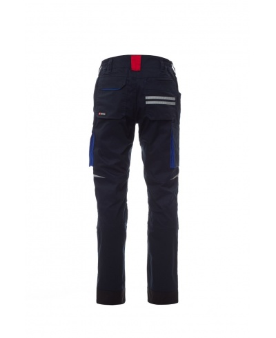 Unisex pants, stretch, all-season, elastic bands on the sides and belt loops at the waist, zipper closure and a customized button. The trousers have two shaped pockets on the front, a coin pocket on the right side and a zippered safety pocket on the left side. On the front of the left leg there is a gusset pocket, a Velcro flap and a name tag pouch. On the front of the right leg there is a phone pocket with a reflective hem and a pocket with a gusset. Both legs have attachments for Nylon O knee pads.