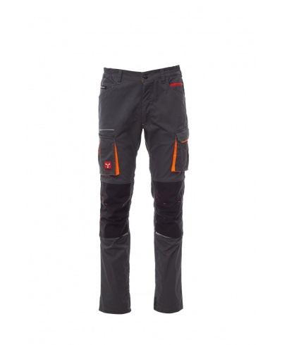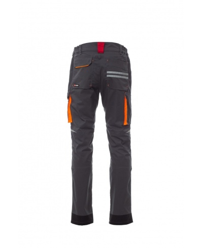 Unisex pants, stretch, all-season, elastic bands on the sides and belt loops at the waist, zipper closure and a customized button. The trousers have two shaped pockets on the front, a coin pocket on the right side and a zippered safety pocket on the left side. On the front of the left leg there is a gusset pocket, a Velcro flap and a name tag pouch. On the front of the right leg there is a phone pocket with a reflective hem and a pocket with a gusset. Both legs have attachments for Nylon O knee pads.