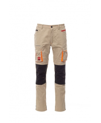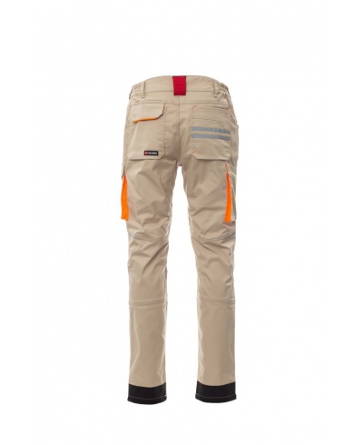 Unisex pants, stretch, all-season, elastic bands on the sides and belt loops at the waist, zipper closure and a customized button. The trousers have two shaped pockets on the front, a coin pocket on the right side and a zippered safety pocket on the left side. On the front of the left leg there is a gusset pocket, a Velcro flap and a name tag pouch. On the front of the right leg there is a phone pocket with a reflective hem and a pocket with a gusset. Both legs have attachments for Nylon O knee pads.