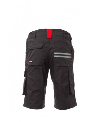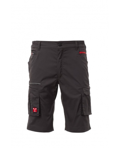 Unisex Bermuda shorts, stretchy, elastic bands on the sides and belt loops at the waist, zipper closure and a customized button. The trousers have two shaped pockets on the front, a coin pocket on the right side and a zippered safety pocket on the left side. On the front of the left leg there is a gusset pocket, a Velcro flap and a name tag pouch. On the front of the right leg there is: a smartphone pocket with reflective trim and a pocket with gusset. On the back there is: a pocket.