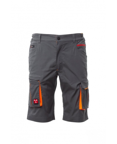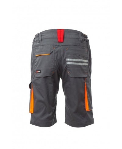 Unisex Bermuda shorts, stretchy, elastic bands on the sides and belt loops at the waist, zipper closure and a customized button. The trousers have two shaped pockets on the front, a coin pocket on the right side and a zippered safety pocket on the left side. On the front of the left leg there is a gusset pocket, a Velcro flap and a name tag pouch. On the front of the right leg there is: a smartphone pocket with reflective trim and a pocket with gusset. On the back there is: a pocket.