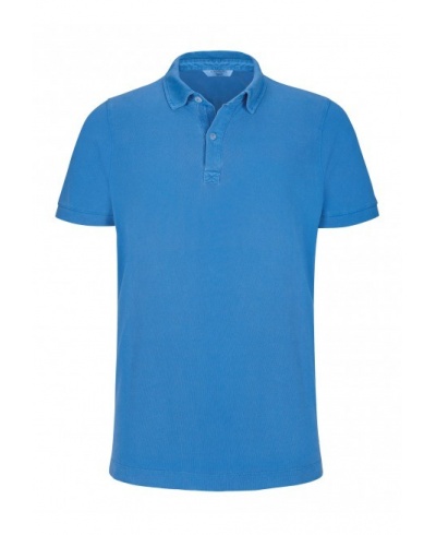 100% preshrunk cotton piqué. Garment washed and dyed for vintage look. Chevron button tab with two clear buttons. Open sleeve.