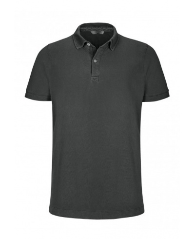 100% preshrunk cotton piqué. Garment washed and dyed for vintage look. Chevron button tab with two clear buttons. Open sleeve.