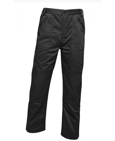 Hardwearing polycotton fabric, durable water repellent finish, fabric weight 245 g/m², 65% polyester 35% cotton fabric, part-elasticated waist, knee pad pockets, belt loops, zip fly opening, metal shank button to CF fasten, 2 front pockets, 1 with small coin pocket, multi zip pocket, 1 side zipped pocket, 2 back pockets, reinforced crotch seam, reinforced seams with triple stitching