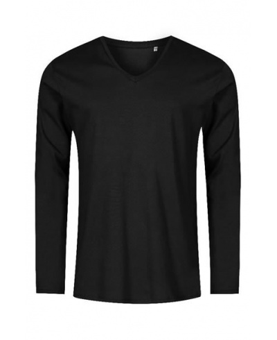 Long-sleeved single jersey T-shirt with a V-neckline and self-fabric collar is made of combed cotton. The especially smooth surface and flowing fabric give the jersey a unique, elastic and silky finish. The T-shirt has a narrow cut and is made with side seams. Certified according to OEKO-TEX®