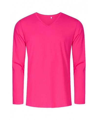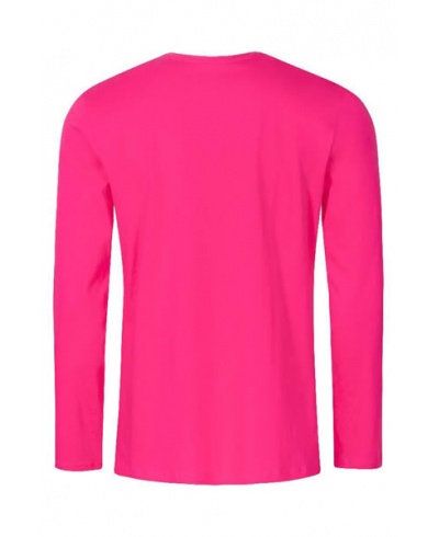 Long-sleeved single jersey T-shirt with a V-neckline and self-fabric collar is made of combed cotton. The especially smooth surface and flowing fabric give the jersey a unique, elastic and silky finish. The T-shirt has a narrow cut and is made with side seams. Certified according to OEKO-TEX®