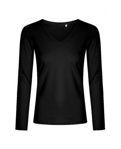 Long-sleeve, V-neck single-jersey t-shirt with collar is made of combed cotton. The especially smooth surface and flowing fabric give the jersey a unique, elastic and silky finish. The T-shirt has a narrow cut and is made with side seams. Certified according to OEKO-TEX®