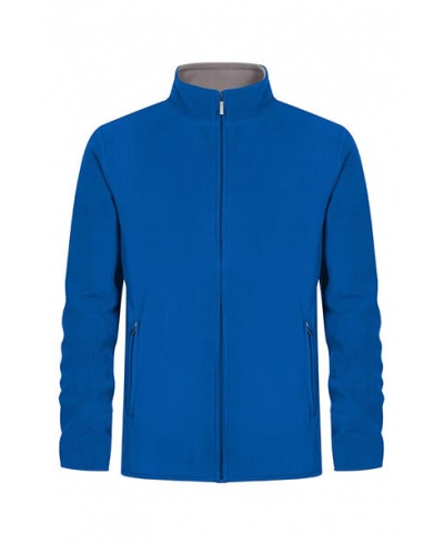 The double-breasted fleece jacket has a full-length concealed zip, narrow cuffs with elastic hem and two zipped side pockets. The inside of the jacket is in a contrasting color and is made of polyester with an anti-pilling treatment on both sides. The fleece jacket has a slim cut.