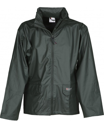 Rain jacket with full concealed plastic zip and metal pull, foldaway hood, drawstring waist, straight sleeves with elasticated inside cuff, two patch pockets, heat taped seams