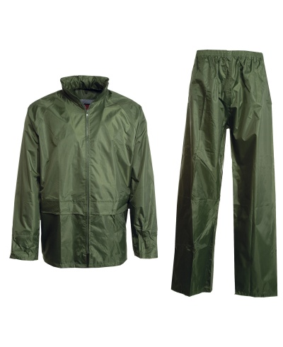 Jacket with zip, foldaway hood, straight sleeves, back mesh. Trousers with elasticated waist and two pockets. Single front with zip