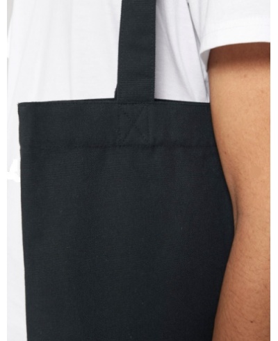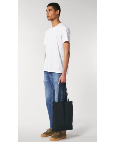 Weight: 300 gsm; Material: 80% RECYCLED COTTON, 20% RECYCLED POLYESTER; Limited Edition: Made from in-house organic cutting waste coming from our black t-shirts; Top edge double folded for strength and clean finish. Long handles with reinforced cross stitch. Shaping seam at bottom to create volume