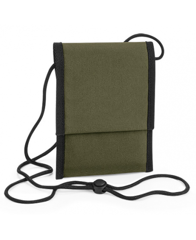 Material: 100% Recycled 600D Polyester; Dimensions: 18 x 14 x 1 cm Capacity: 0.5 litres; Recycled Polyester made from 100% rPET, equivalent to 2 post-consumer bottles, PVC Free, small valuables pocket, passport pocket, Rip-Strip™ closure, adjustable neck cord, tearAway label for ease of rebranding