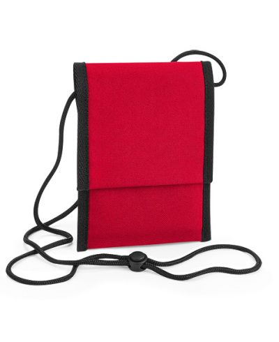 Material: 100% Recycled 600D Polyester; Dimensions: 18 x 14 x 1 cm Capacity: 0.5 litres; Recycled Polyester made from 100% rPET, equivalent to 2 post-consumer bottles, PVC Free, small valuables pocket, passport pocket, Rip-Strip™ closure, adjustable neck cord, tearAway label for ease of rebranding