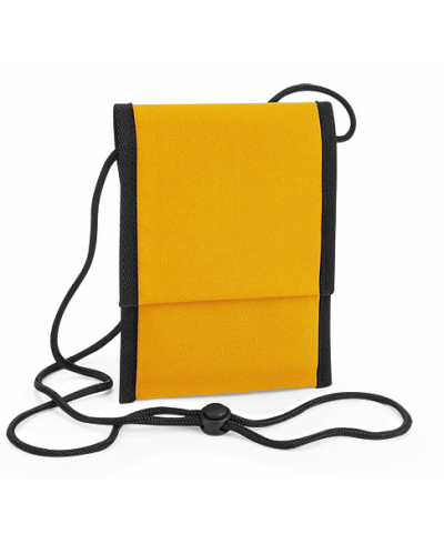 Material: 100% Recycled 600D Polyester; Dimensions: 18 x 14 x 1 cm Capacity: 0.5 litres; Recycled Polyester made from 100% rPET, equivalent to 2 post-consumer bottles, PVC Free, small valuables pocket, passport pocket, Rip-Strip™ closure, adjustable neck cord, tearAway label for ease of rebranding