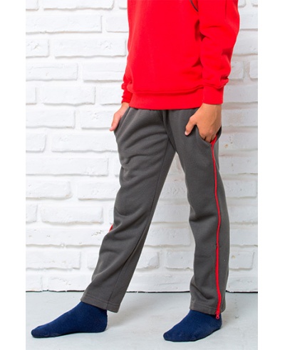 Kid pants. Elastic waistband with drawcord and side pockets in contrast. Piping and zipper in the bottom, also in contrast.