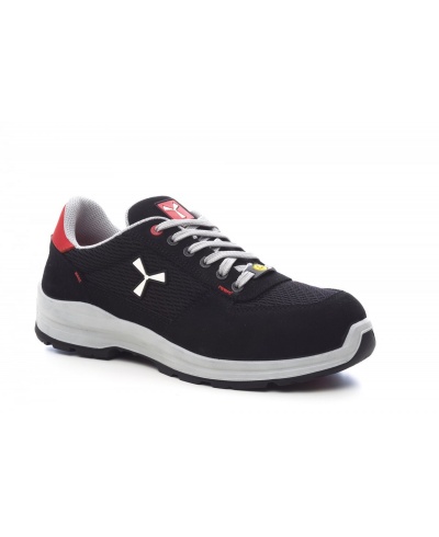 Men's low safety shoe, upper in water-repellent split leather with inserts in breathable technical fabric, inner lining (throughout the internal surface), breathable and resistant to abrasion, 6 + 6 metal-free eyelets, reflective insert in the heel guard, die-cast aluminium tip, Ortholite X40 016 ESD removable arch support, certified anti-puncture reinforced fabric insole, anti-torsion shank, horseshoe-shaped under-toe, ultra-light ESD polyurethane mid-sole, high tenacity and balanced density ESD polyether MASTER BALANCE cushioning, XTRAIL GRIP outsole in ESD TPU with heel and tip guard