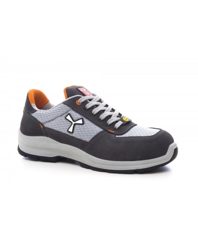 Men's low safety shoe, upper in water-repellent split leather with inserts in breathable technical fabric, inner lining (throughout the internal surface), breathable and resistant to abrasion, 6 + 6 metal-free eyelets, reflective insert in the heel guard, die-cast aluminium tip, Ortholite X40 016 ESD removable arch support, certified anti-puncture reinforced fabric insole, anti-torsion shank, horseshoe-shaped under-toe, ultra-light ESD polyurethane mid-sole, high tenacity and balanced density ESD polyether MASTER BALANCE cushioning, XTRAIL GRIP outsole in ESD TPU with heel and tip guard