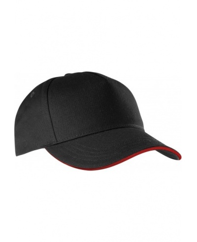 100% cotton twill. 5 laminated panel cap with contrasted sandwich peak and cotton sweatband. Size adjuster with tear release fastening.