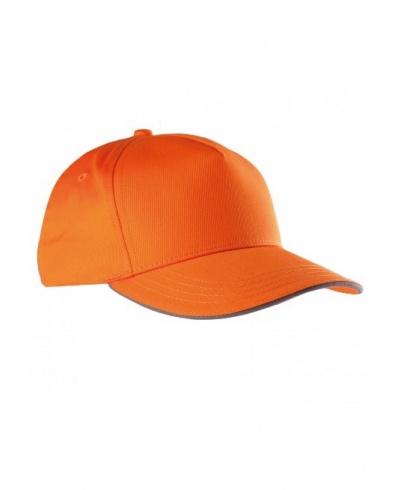 100% cotton twill. 5 laminated panel cap with contrasted sandwich peak and cotton sweatband. Size adjuster with tear release fastening.