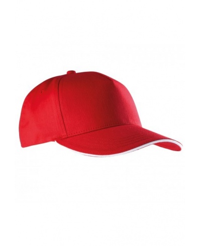 100% cotton twill. 5 laminated panel cap with contrasted sandwich peak and cotton sweatband. Size adjuster with tear release fastening.