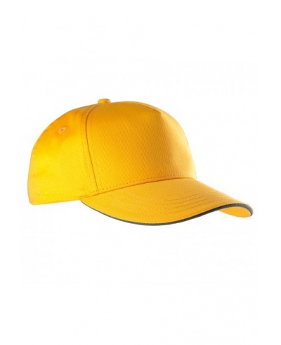 100% cotton twill. 5 laminated panel cap with contrasted sandwich peak and cotton sweatband. Size adjuster with tear release fastening.
