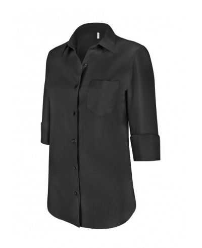 65% polyester / 35% cotton poplin. Easy-care. Non-button down collar. Dyed to match buttons. V-shaped chest pocket on left side. 1 spare button. Rounded bottom hem.