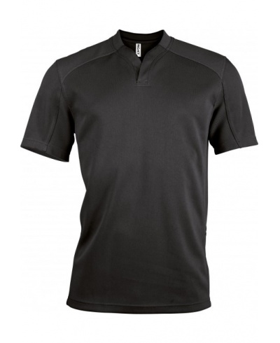 100% polyester interlock and mesh. Matching mesh panels. Open V-neck. Twin needle finishing.Reinforced durable stitching.