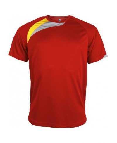 100% polyester. Quick drying fabric. Contrast panels. Matching coverstitch finishing. Twin needle finishing.