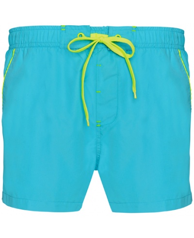 Short swimsuit. Elastic waistband with central loops with drawstring and metal eyelets in contrast. Side pockets with ribbed in contrast and back pocket with velcro, handle and drain hole in contrast. Bottom slide. Inner lining and mesh lining pockets.