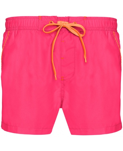 Short swimsuit. Elastic waistband with central loops with drawstring and metal eyelets in contrast. Side pockets with ribbed in contrast and back pocket with velcro, handle and drain hole in contrast. Bottom slide. Inner lining and mesh lining pockets.