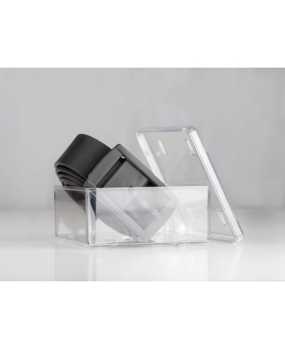 100% TPE Clear plastic buckle. Adjustable length from XS to 3XL. Comes in a hard plastic case.