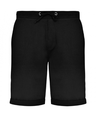 Sport shorts with elastic waistband and adjustable draw cord. Simulated zipper. Side pockets, back pocket and folded bottoms with security stitches.