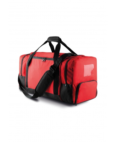 Sports/games bag in polyester 600D PVC backing. 2 side pockets and a shoe storage compartment, removable padded shoulder strap. Transparent label holder for easy identification. Medium size model: 55 liters. SBS zips.