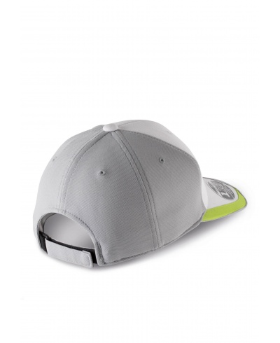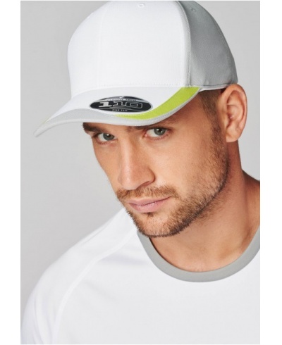 100 % polyester. 6 panels. Curved peak and reinforced panels inside crown to maintain shape. Contrast colour panels. Flexfit® Cool & Dry technology for added comfort and optimal absorption of moisture on inner elasticated band. Size adjuster with tear release fastening.