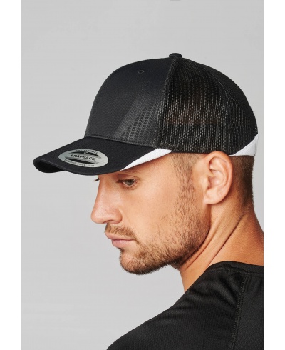 66 % polyester / 30 % polyamide / 4 % cotton ® with polyamide mesh. 6 panels. Curved peak and reinforced inside crown to maintain shape. Flexfit® Cool & Dry technology for added comfort and optimal absorption of moisture on inner elasticated band. Contrast panels on peak and mesh. Size adjuster with plastic strip.