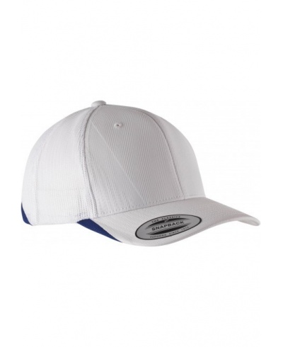 66 % polyester / 30 % polyamide / 4 % cotton ® with polyamide mesh. 6 panels. Curved peak and reinforced inside crown to maintain shape. Flexfit® Cool & Dry technology for added comfort and optimal absorption of moisture on inner elasticated band. Contrast panels on peak and mesh. Size adjuster with plastic strip.