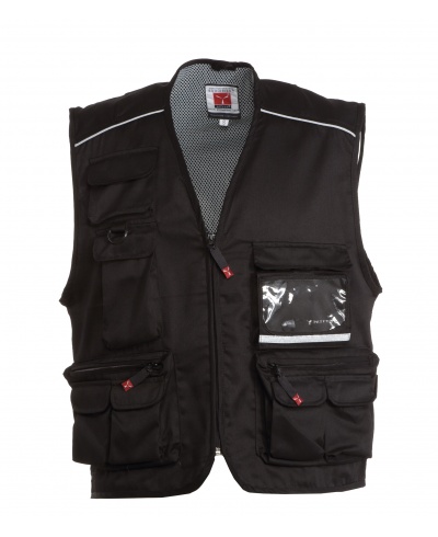 Summer vest, zip fastening, multi-front pocket system with reversible badge holder, reflex piping on the shoulders and back, roomy back hunting pocket. Contrasting colour dry-tech lining, open for easier printing and embroidery