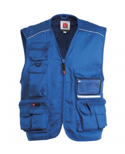 Summer vest, zip fastening, multi-front pocket system with reversible badge holder, reflex piping on the shoulders and back, roomy back hunting pocket. Contrasting colour dry-tech lining, open for easier printing and embroidery