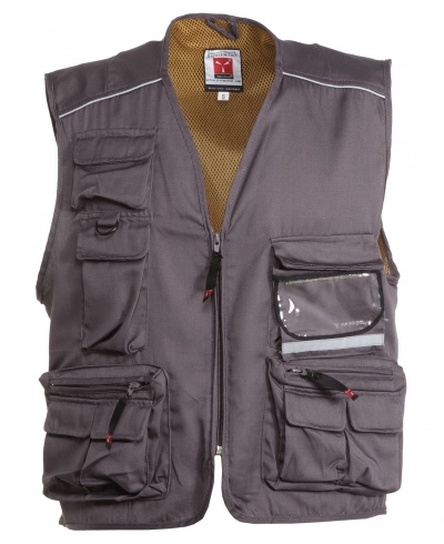 Summer vest, zip fastening, multi-front pocket system with reversible badge holder, reflex piping on the shoulders and back, roomy back hunting pocket. Contrasting colour dry-tech lining, open for easier printing and embroidery
