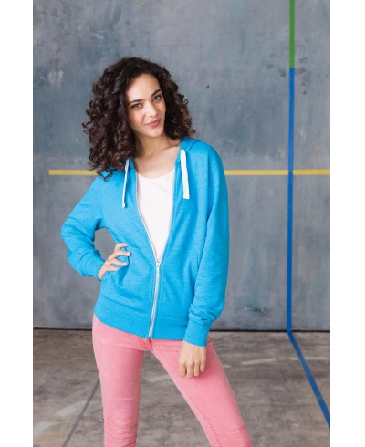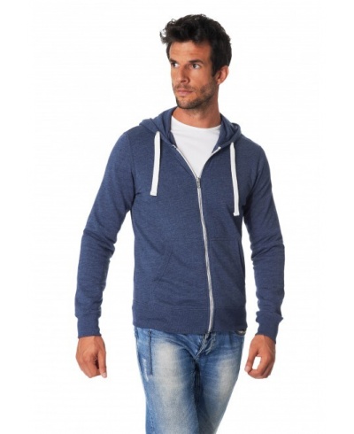 52% combed cotton / 48% polyester. French Terry. Kangaroo pocket. Lined hood with contrast drawcord. Ribbed cuffs and waistband. Full front zip.