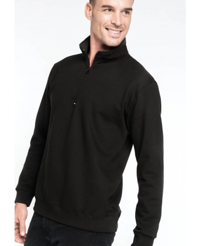 80 % cotton / 20 % polyester. Brushed fleece. Set-in sleeves. Tubular cut. Zipped and taped neck. Matching ribbed cuffs and hem.