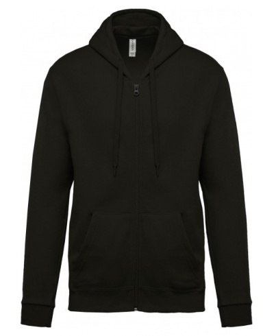 80 % cotton / 20 % polyester. Brushed fleece. Set-in sleeves. Tubular cut. Nylon zip fastening. Lined hood with matching drawstring. Kangaroo pockets. Ribbed cuffs and hem.