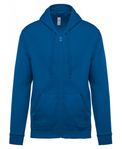 80 % cotton / 20 % polyester. Brushed fleece. Set-in sleeves. Tubular cut. Nylon zip fastening. Lined hood with matching drawstring. Kangaroo pockets. Ribbed cuffs and hem.