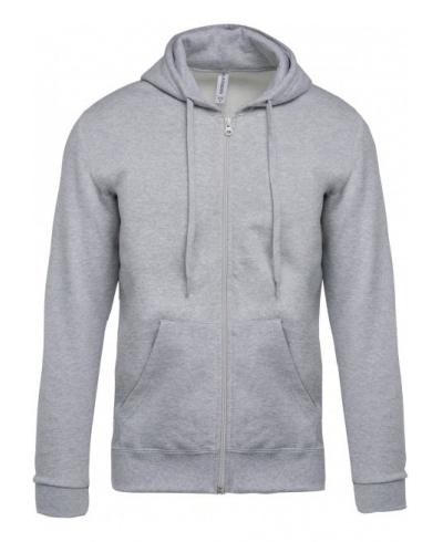 80 % cotton / 20 % polyester. Brushed fleece. Set-in sleeves. Tubular cut. Nylon zip fastening. Lined hood with matching drawstring. Kangaroo pockets. Ribbed cuffs and hem.
