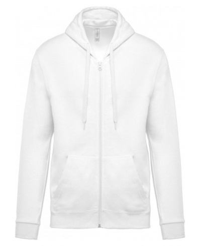 80 % cotton / 20 % polyester. Brushed fleece. Set-in sleeves. Tubular cut. Nylon zip fastening. Lined hood with matching drawstring. Kangaroo pockets. Ribbed cuffs and hem.