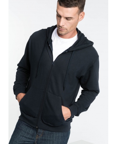 80 % cotton / 20 % polyester. Brushed fleece. Set-in sleeves. Tubular cut. Nylon zip fastening. Lined hood with matching drawstring. Kangaroo pockets. Ribbed cuffs and hem.