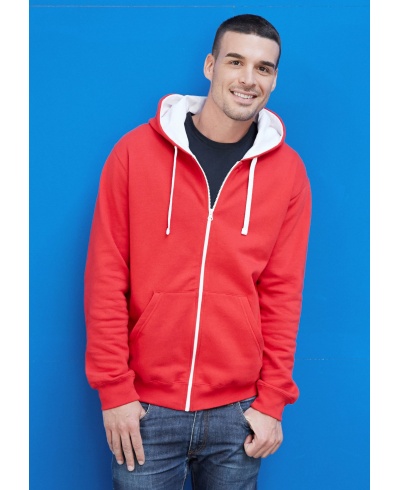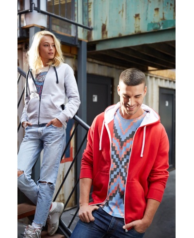 80% combed cotton / 20% polyester. Brushed fleece. Earphone port in kangaroo pocket and neck. Ribbed cuffs and hem. Lined, contrasting hood with drawstring. Contrast YKK® zip.