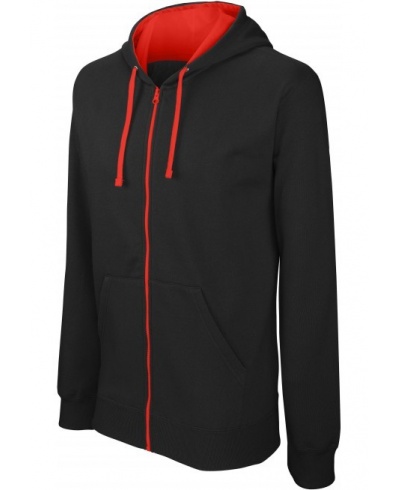 80% combed cotton / 20% polyester. Brushed fleece. Earphone port in kangaroo pocket and neck. Ribbed cuffs and hem. Lined, contrasting hood with drawstring. Contrast YKK® zip.